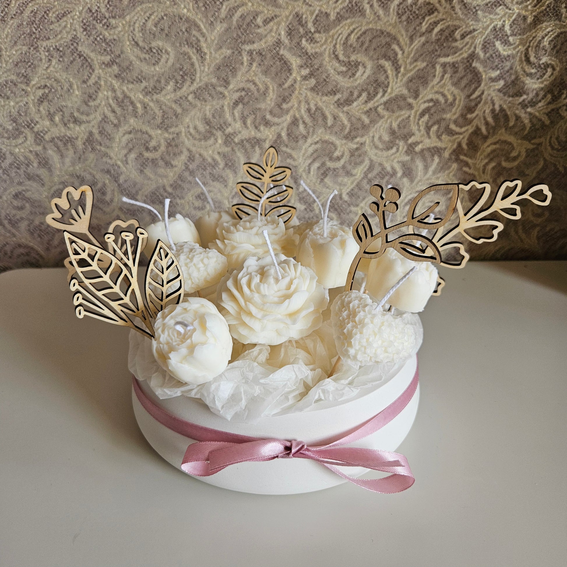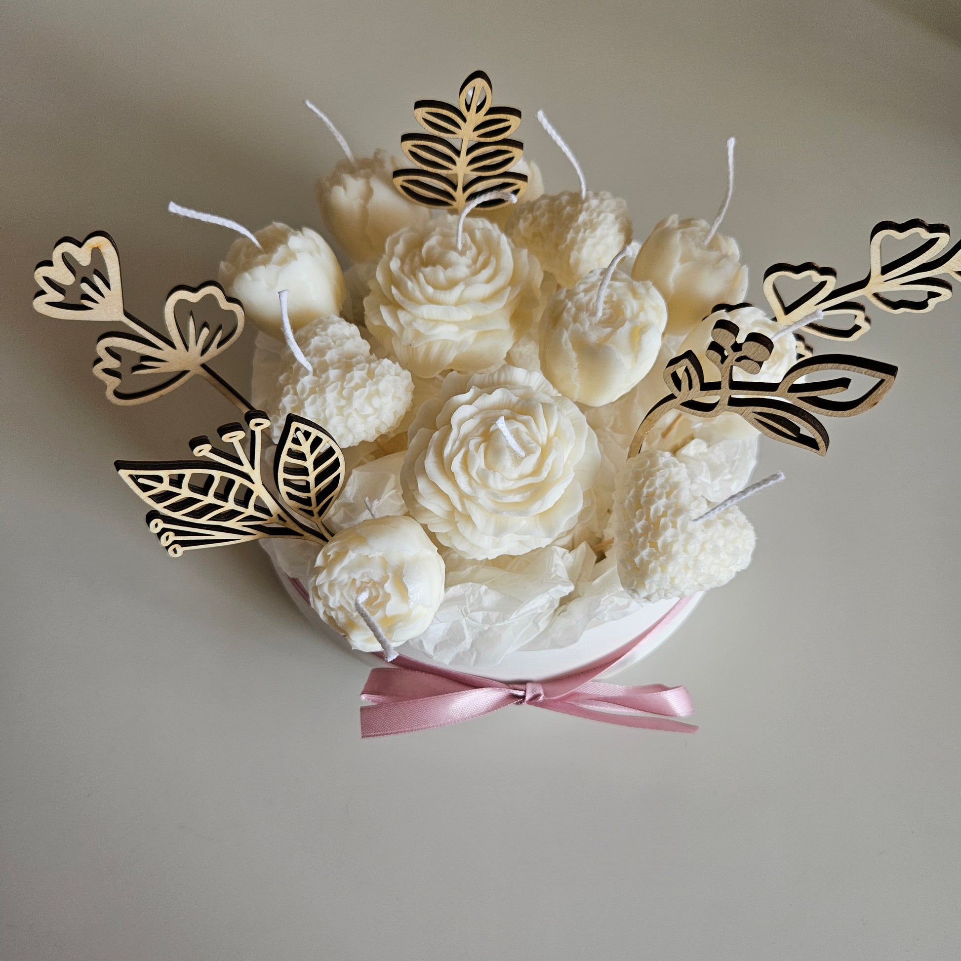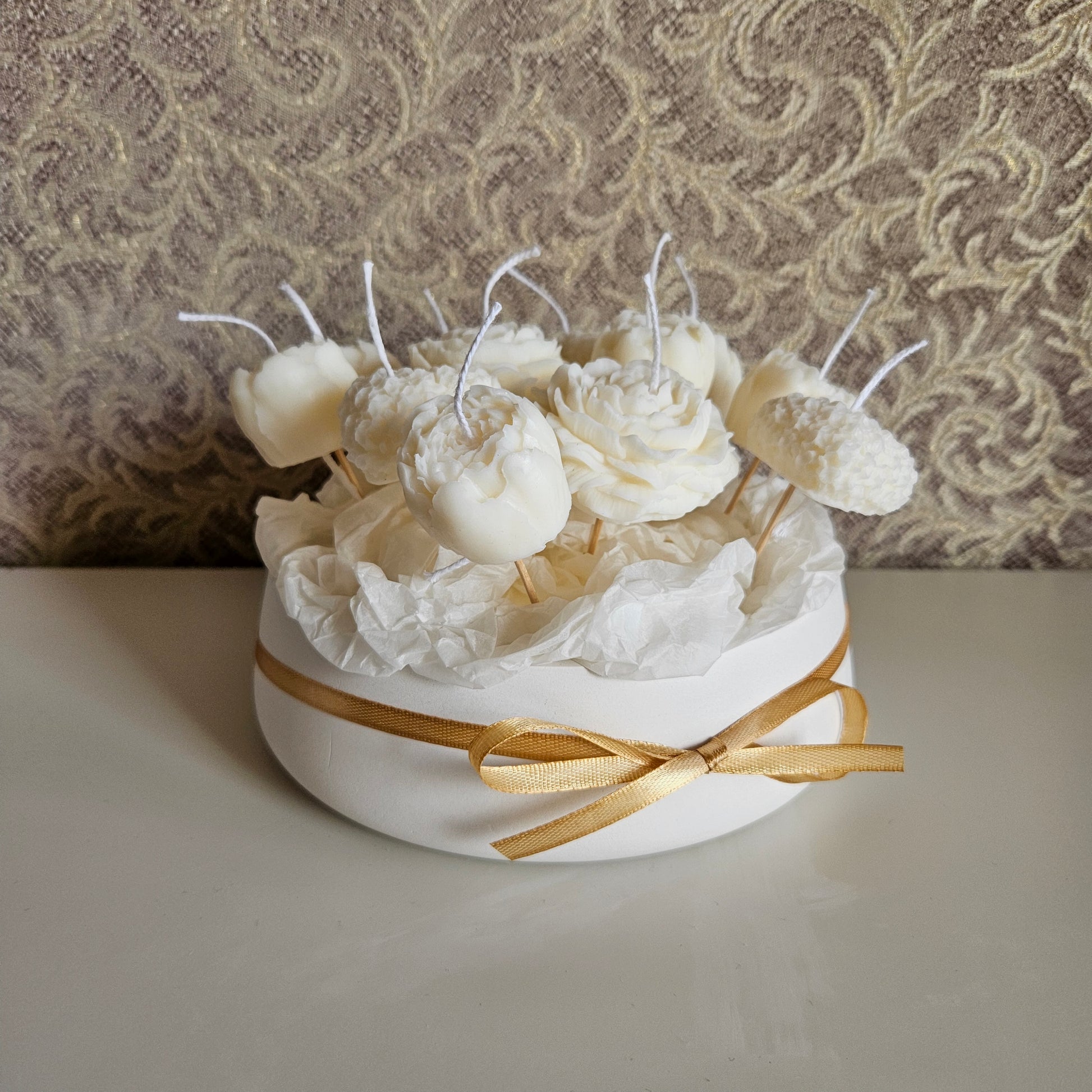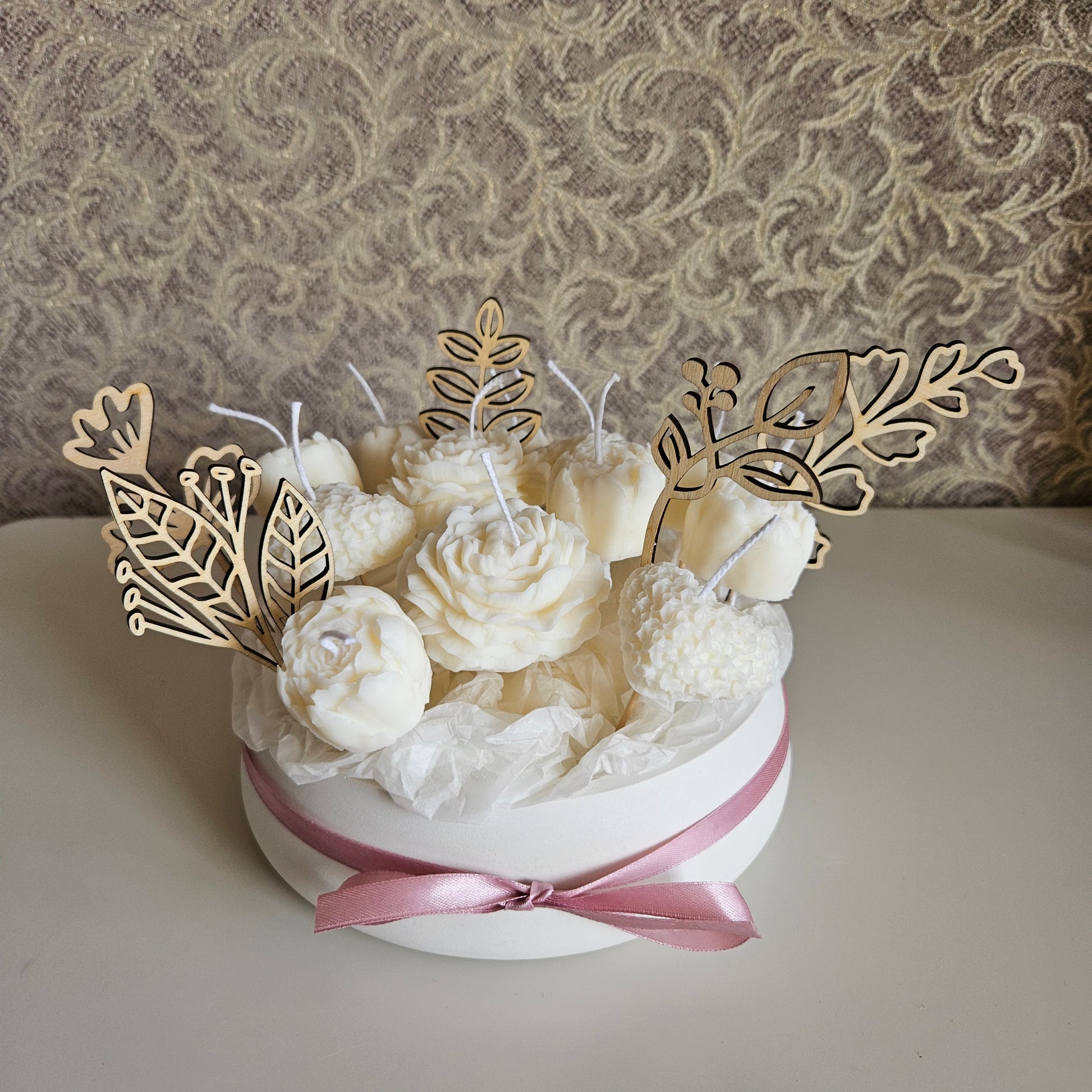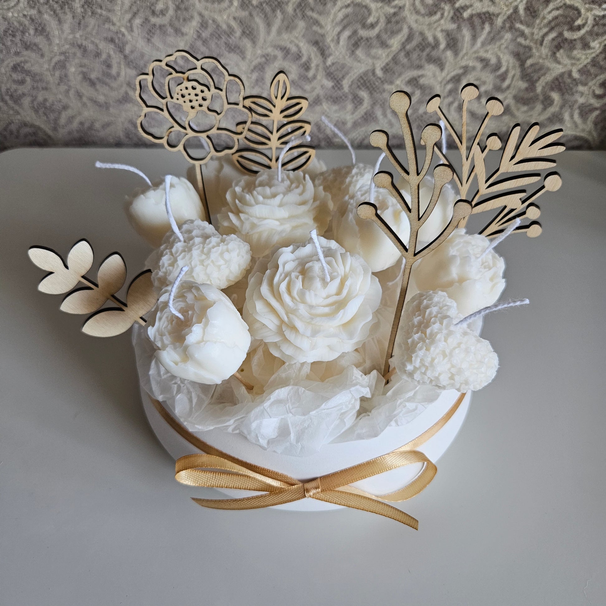 Create a cozy atmosphere with our candle flower bouquet in a plaster bowl. The candle is made from soy wax, providing a clean burn and lasting fragrance. The bowl is crafted from gypsum coated with a protective varnish, ensuring a long-lasting and beautiful addition to any room.