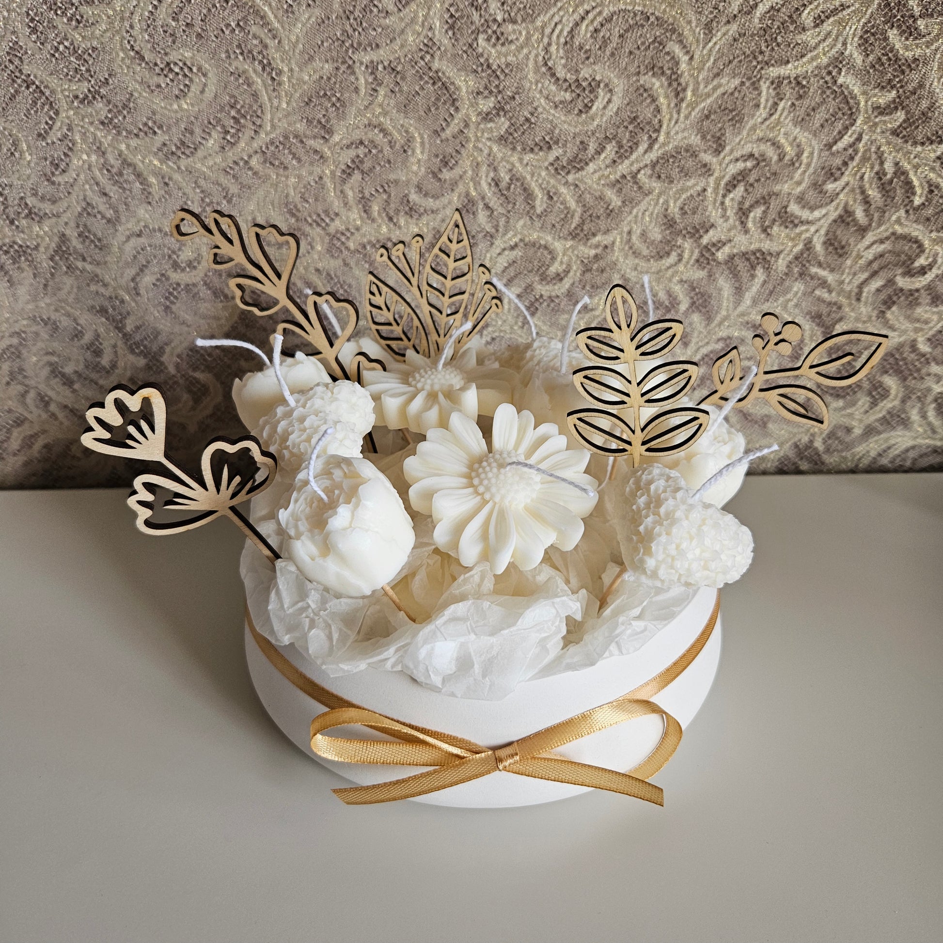 Create a cozy atmosphere with our candle flower bouquet in a plaster bowl. The candle is made from soy wax, providing a clean burn and lasting fragrance. The bowl is crafted from gypsum coated with a protective varnish, ensuring a long-lasting and beautiful addition to any room.